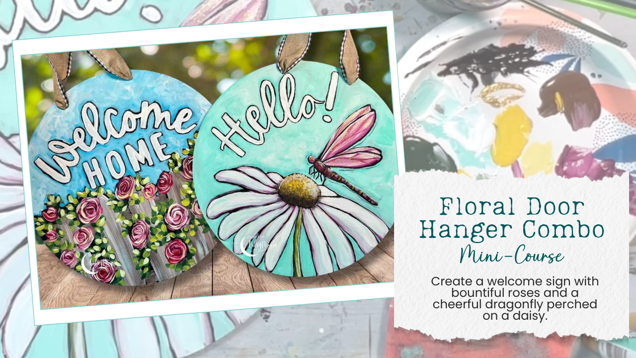 Brighten your entryway with this beautiful two-project mini-course! In the Floral Door Hanger Combo, Karen teaches you how to paint a charming “Welcome Home” sign bursting with bountiful roses, along with a cheerful “Hello!” door hanger featuring a vibrant dragonfly perched on a daisy. These fresh, floral designs are perfect for spring, summer, or adding a pop of color any time of year.