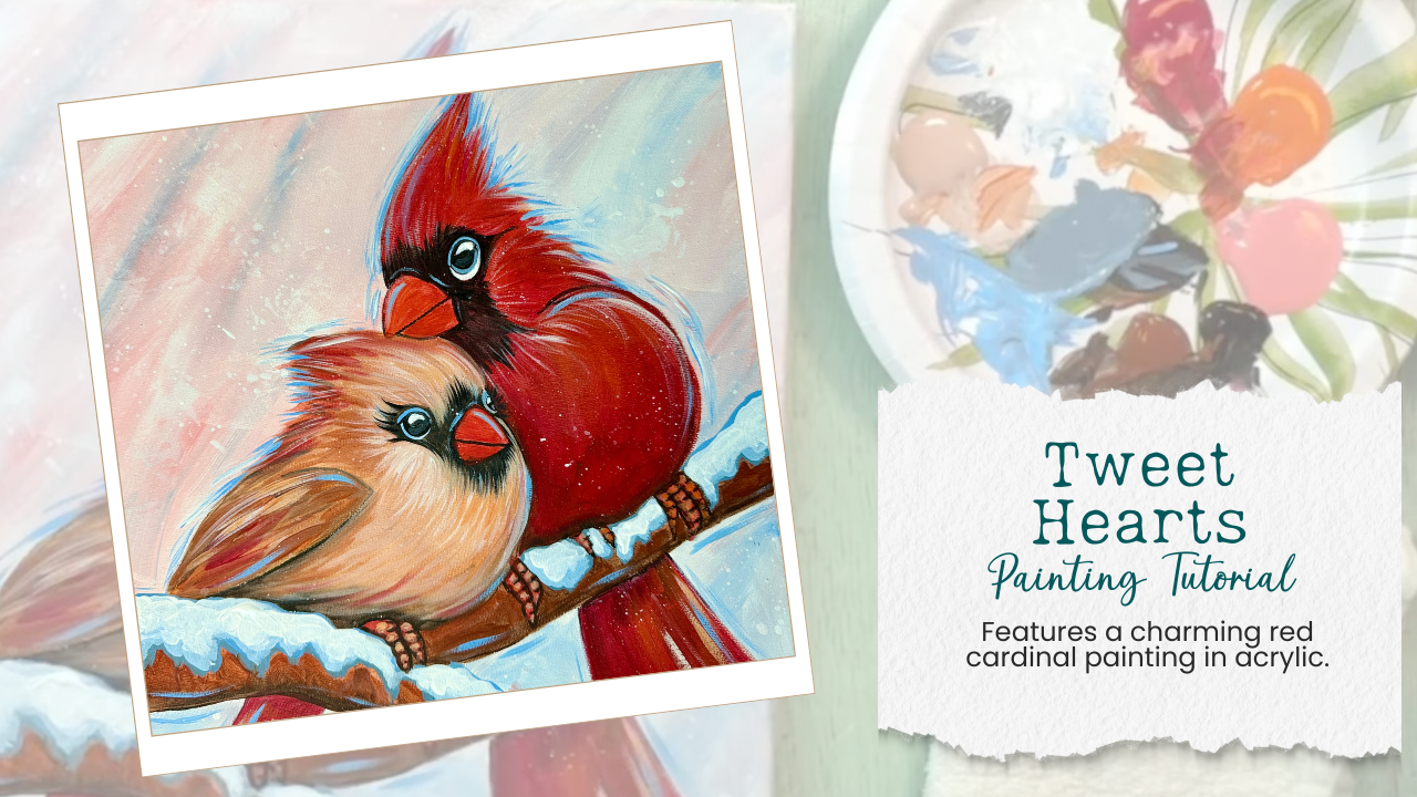 Celebrate love and cozy winter moments with the Tweet Hearts painting tutorial! This heartwarming project guides you step by step through painting two sweet cardinals cuddled together on a snowy branch, creating a scene that feels peaceful, romantic, and full of charm. With Karen’s easy, encouraging instruction, you’ll learn how to paint expressive birds, soft winter textures, and rich pops of color that bring the piece to life. Perfect for painters of all skill levels, this design is a relaxing way to enjoy the painting process and create a treasured winter artpiece.