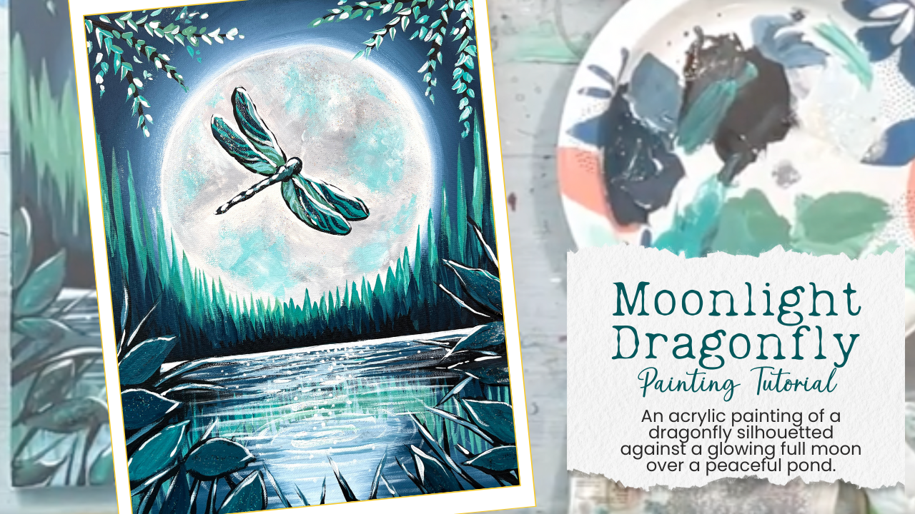 Create a breathtaking nighttime scene with “Moonlight Dragonfly”! This stunning design features a shimmering dragonfly soaring across a glowing full moon, reflected beautifully over a quiet forest pond. Karen guides you through each step to help you capture the soft glow, rich teal tones, and captivating movement in this elegant piece. Perfect for anyone who loves serene, nature-inspired art and wants to paint something truly eye-catching.