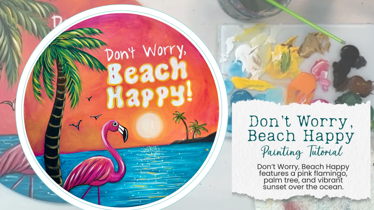 Bring a splash of tropical fun with “Don’t Worry, Beach Happy”! This vibrant door hanger features a cheerful pink flamingo, swaying palm trees, and a glowing sunset that instantly sets a sunny, carefree mood. Karen guides you step-by-step to create a bright, beachy piece that welcomes guests with warmth and personality — perfect for summer decorating or anyone who loves coastal style.