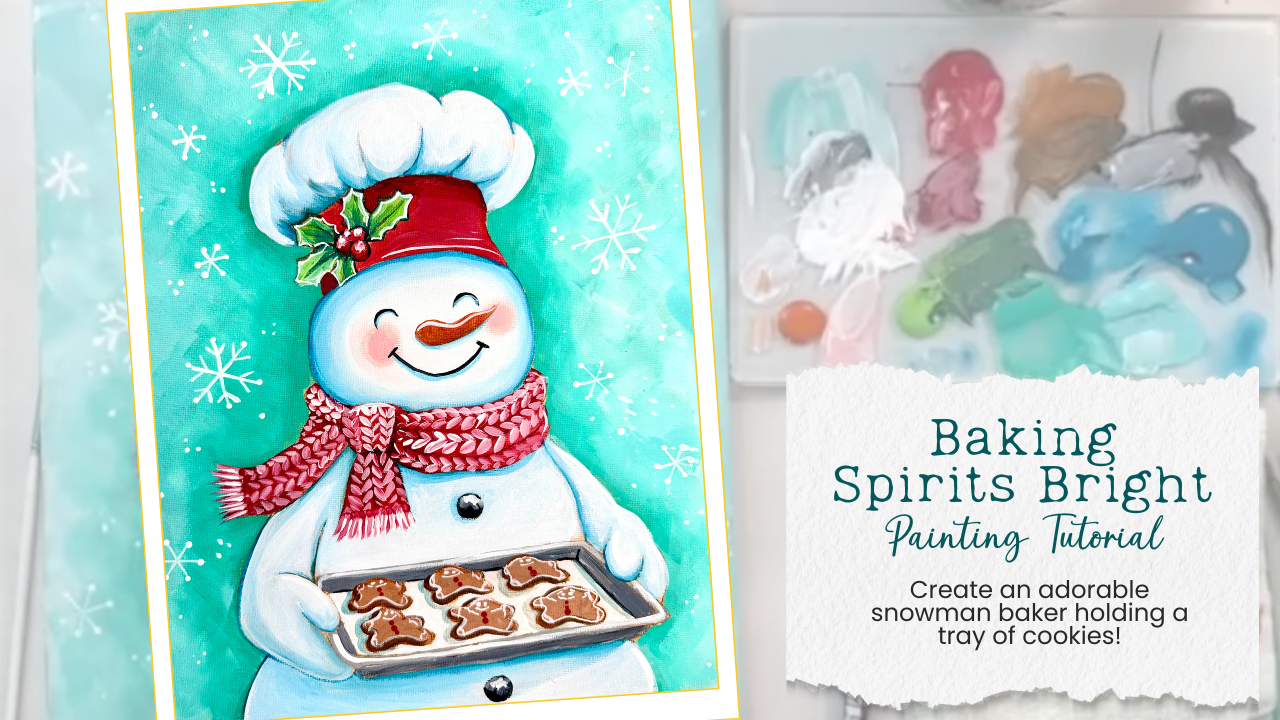 Add a dash of holiday cheer to your creative time with “Baking Spirits Bright”! This adorable tutorial features a happy snowman baker proudly holding a fresh tray of Christmas cookies, set against a snowy, teal winter backdrop. Karen guides you step-by-step to create a heartwarming, whimsical piece that’s perfect for holiday decorating, gift-giving, or enjoying a cozy paint night at home.