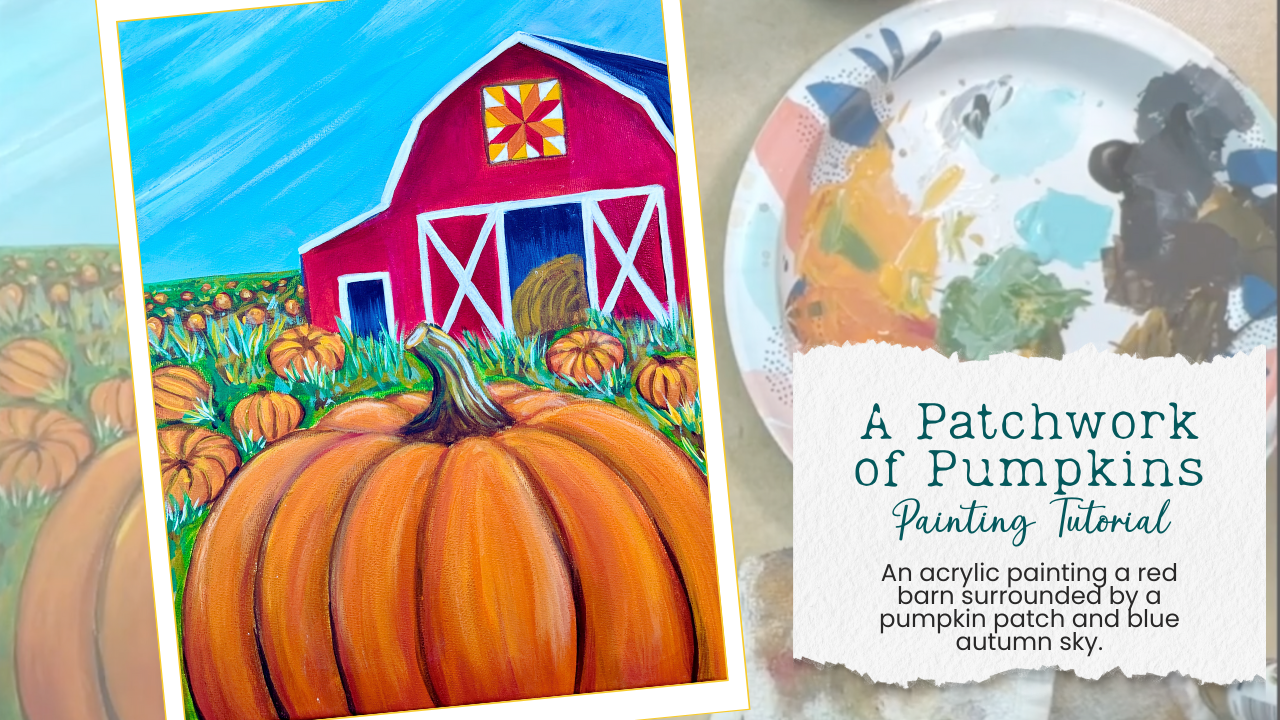 Step into the heart of harvest season with “A Patchwork of Pumpkins”! This charming tutorial guides you through painting a vibrant autumn landscape featuring a cozy red barn, rolling fields of pumpkins, and a bright blue fall sky. Karen makes it easy to capture all the color and texture that make this scene a seasonal favorite — perfect for fall decorating, craft nights, or anyone who loves farmhouse-style art.