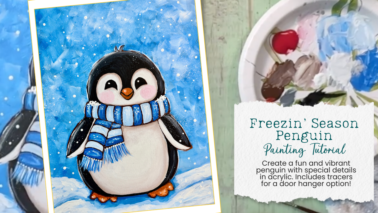 Celebrate the cozy side of winter with the Freezin’ Season Penguin painting tutorial! This cheerful project walks you step by step through painting an adorable penguin bundled up for the cold, set against a soft winter sky with gently falling snow. With Karen’s easy, encouraging guidance, you’ll learn how to build layers, add personality, and create a cozy winter scene that’s full of heart and whimsy. Perfect for painters of all skill levels, this joyful design is a fun way to relax, enjoy the process, and add a touch of winter magic to your decor.